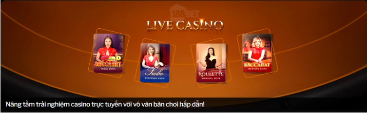 Người chơi casino 188BET có thể lựa chọn từ hàng chục thể loại game casino đỉnh cao với nhiều biến thể và mức cược linh hoạt.