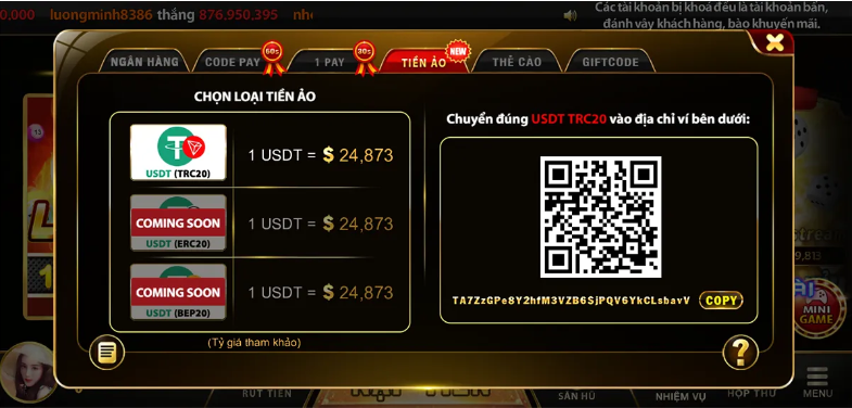 Taigo88.poker hân hạnh mang đến tính năng nạp tiền go88 bằng tiền ảo USDT nạp vào cổng game qua sàn Binance. Chức năng nạp tiền ảo này giúp anh em game thủ trải nghiệm thanh toán nhanh chóng, bảo mật và tiện lợi hơn bao giờ hết!
